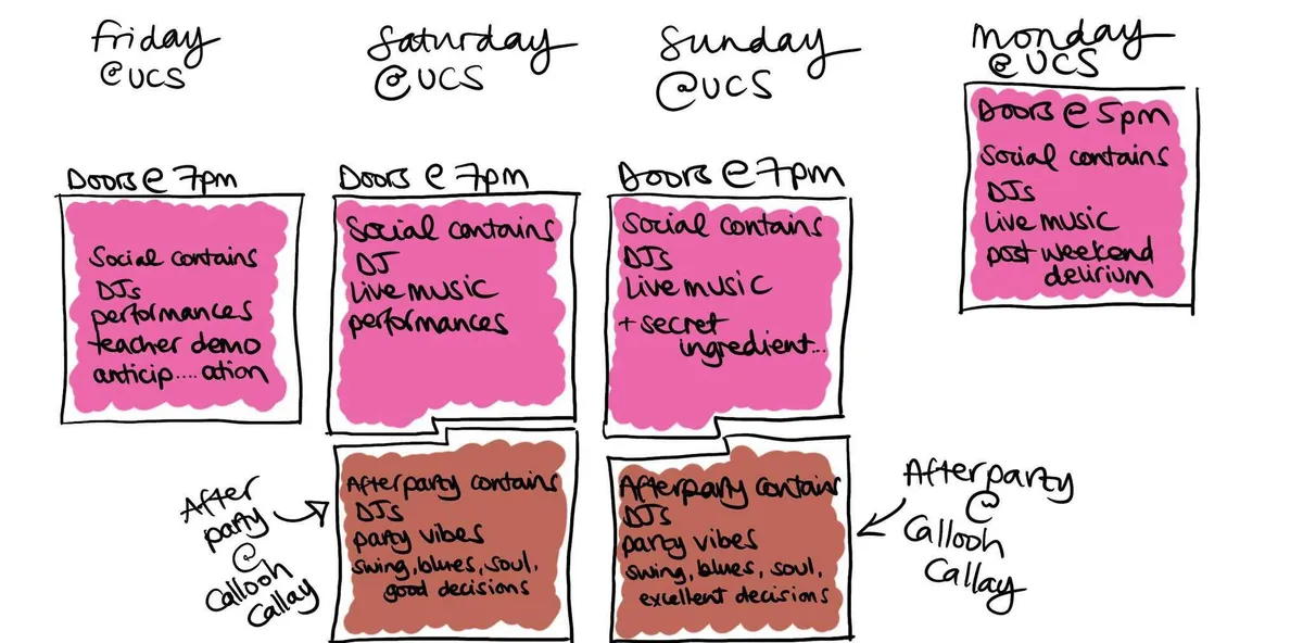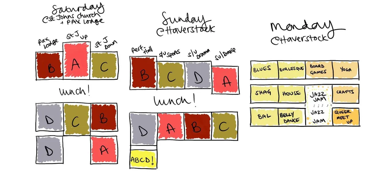 | 11:30–12:30 | Blues - Anna & Ryan | Burlesque - Nancy | Board Games - Andy G | Yoga - Rom |
